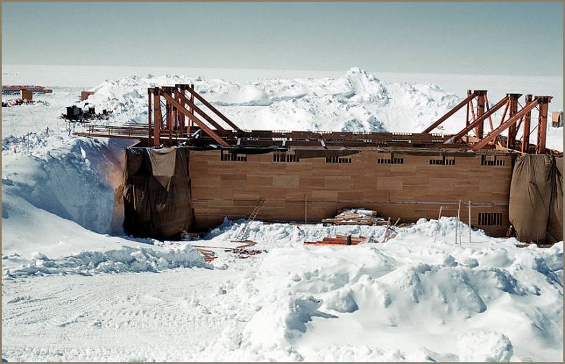 construction taken in June of 1959. A 30-foot hole was dug into the ice. Timber foundations were laid on the